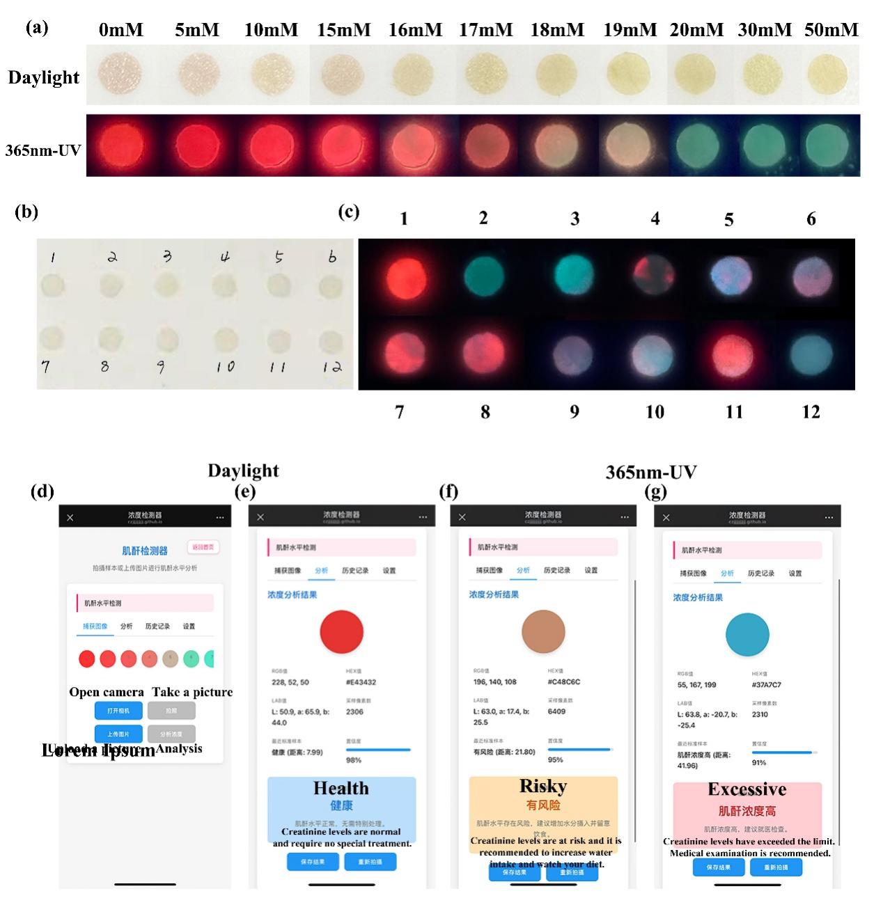 图 3Cr、AuNPs及N-CDs的径向分布函数(RDFs)以及分子模拟示意图 在真实尿液样本条件下,体系围绕17 mM阈值实现分级识别:低浓度呈红光主导,跨越阈值区间出现红绿并存,高浓度以绿光主导;在多温度与多湿度条件下的纸基读数保持一致性,表明对现场环境具有鲁棒性。配套开发的智能手机应用在365 nm手持UV光源下获取图像,完成白平衡校正、RGB→CIE转换,并基于预标定逻辑回归模型输出“<15 mM(低风险)、15–20 mM(过渡)、>20 mM(高风险)”的分级判定,支持数据记录与导出,形成“纸基-移动端”的一体化POC工作流。该体系以低成本、快速、可复制的工程特征面向基层与资源受限场景,具备向微流控集成与智能随访扩展的可转化潜力。