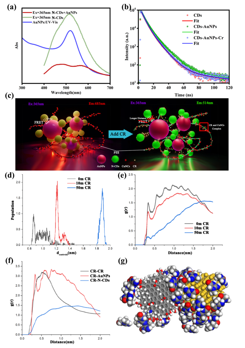 图 2 墨水的流变特性及刮涂成型流程示意。 稳态/时间分辨荧光与UV-Vis表征证明N-CDs发射与AuNPs的SPR在≈520 nm处高重叠,为FRET通道提供能量学基础;随Cr升高,N-CDs与AuNPs有效距离增大、FRET效率下降、绿光恢复,与“CuNCs被络合淬灭”的红光衰减共同构成比率跃迁。分子动力学模拟给出N-CDs/AuNPs相互作用的径向分布函数(RDF)随Cr浓度增加而显著衰减,在最高浓度下主峰接近消失,指示两相纳米界面相互作用被Cr削弱并促成颗粒分离;同时Cr对AuNPs的吸附强于对N-CDs,从而进一步降低FRET耦合几率,这一机理证据与实验光谱-成像结果相互印证。