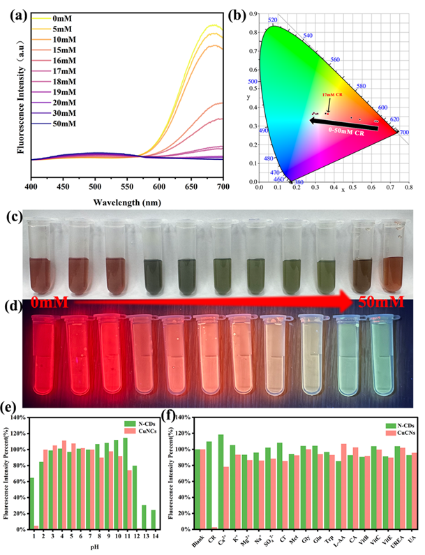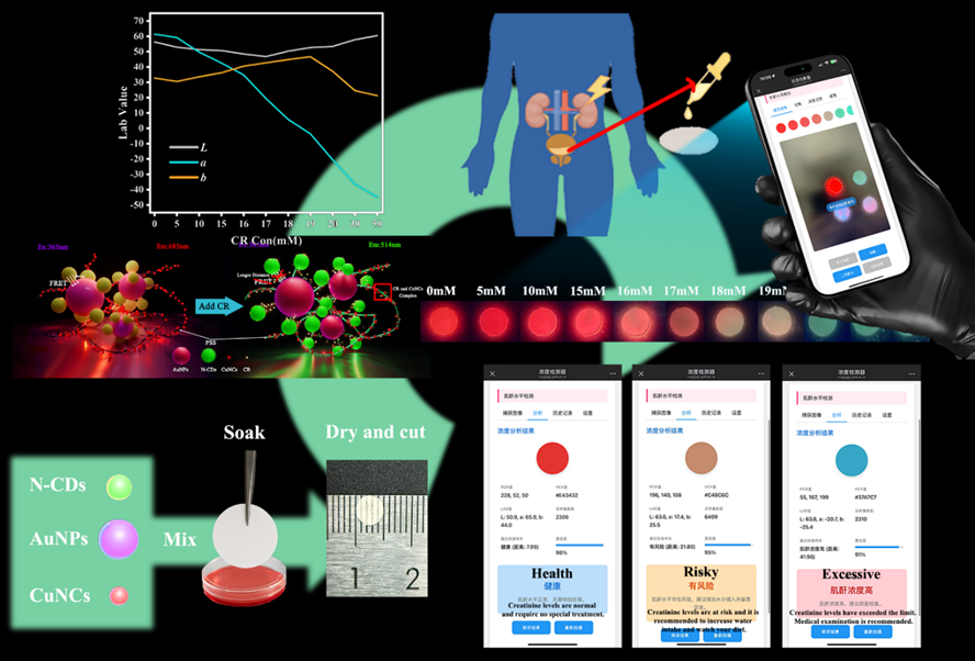 发表时间:2025-09-22 21:00 面向全球肾脏疾病早筛的迫切需求,武汉大电子信息学院先进光谱与智能传感团队、中南医院肾内科等多学科联合提出一体化的“纸基材料—双荧光探针—移动端读数”技术路线,构建出面向尿液肌酐(Creatinine, Cr)的便携式比率荧光传感器,实现从基础纳米材料设计、机理阐释到临床可用性的系统打通。论文以此为切入点,提出在纸基载体上集成“比色-荧光双探针+FRET耦合”的便携式比率读数体系,通过材料设计与工程实现,面向现场快速判读、降低装备依赖与缩短检测链路,服务于初筛、分级与随访的连续化应用。该研究明确了从传感原理到应用验证的技术闭环与临床价值取向,定位为对传统检测范式的工程化补充与替代。该研究以氮掺杂碳点(N-CDs,绿光发射约520 nm)与铜纳米簇(CuNCs,红光发射约680 nm)为双通道读数核心,并引入金纳米颗粒(AuNPs)构建与N-CDs发射峰高度重叠的表面等离子体吸收,以荧光共振能量转移(FRET)显著提升灵敏度与选择性。体系在1–50 mM范围内稳定响应,并在临床关键阈值17 mM处呈现由红向绿的明显跃迁,支持肉眼快速判别。
