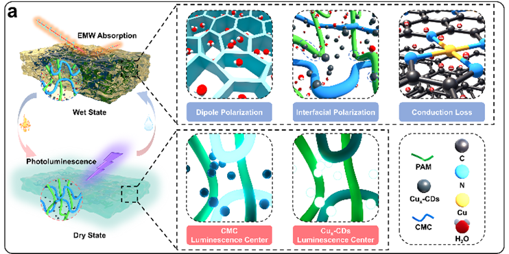 发表时间:2026-01-22 12:43 随着5G通信、雷达探测与便携电子设备的快速发展,电磁波污染与信息安全问题日益突出。传统吸波材料往往功能单一、响应僵化,难以适应复杂多变的应用环境。另一方面,光学加密材料虽在信息安全领域前景广阔,但常与电磁功能难以兼容。如何在同一材料中实现环境触发、功能切换、多模响应,成为智能材料设计的前沿挑战。基于上述背景,武汉大学电子信息学院先进光谱与智能传感团队研究人员,设计并合成了一种基于水驱动状态切换的智能水凝胶复合材料,以铜掺杂碳点(Cux-CDs)增强聚丙烯酰胺/羧甲基纤维素(PAM/CMC)复合水凝胶(PCC)。通过Cu掺杂调控水凝胶内部的氢键网络与水分状态,实现了材料介电性能与光学性能的协同优化。湿态下Cu掺杂增加了自由水比例,促进了偶极极化和界面电荷迁移,显著增强了对电磁波的损耗能力。脱水变为干态后聚合物网络重构为刚性框架,有效抑制非辐射跃迁,从而激活了来自碳点与CMC基质的稳定室温磷光。