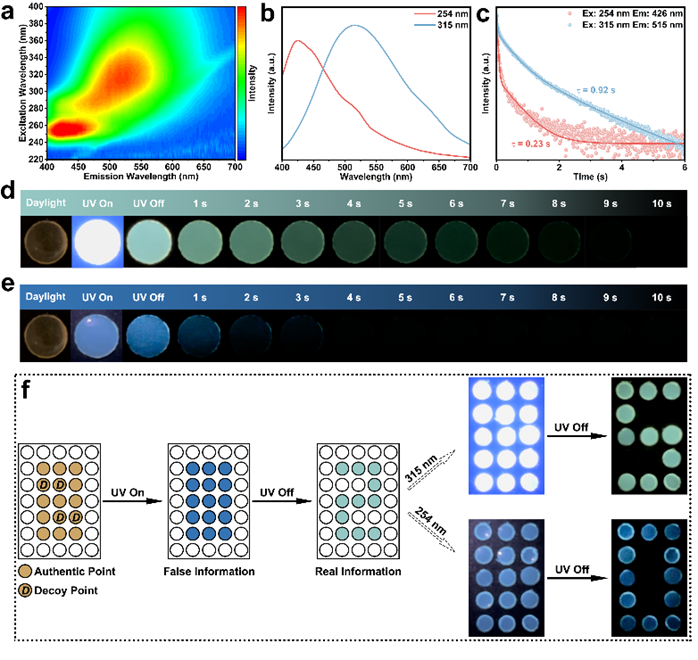 图1 一种基于水驱动状态切换的智能水凝胶复合材料示意图 该材料在湿态下表现出优异的微波吸收性能,而在干态下则呈现稳定的室温磷光发射,实现了电磁屏蔽与光学信息加密的双重功能集成。在2-18 GHz频率范围内,最优样品(PCC-4)的最小反射损耗达-62.67 dB,有效吸收带宽达5.94 GHz,表现出优异的电磁波衰减能力。干燥后材料在紫外光激发下,呈现蓝光(426 nm)与绿光(515 nm)双发射,其中绿光磷光寿命长达0.92 s,通过点阵图案设计,实现信息在荧光背景下的磷光隐藏与读取,展现了其在高级防伪与信息加密中的应用前景。